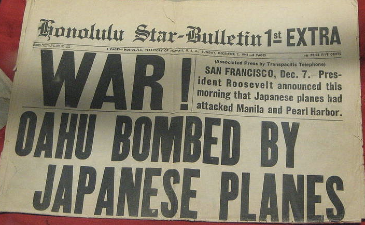Pearl Harbor was attacked by Japanese planes, in a surprise attack which prompted President Franklin Roosevelt to declare in a speech the following day that December 7th would be “a date which will live in infamy.”