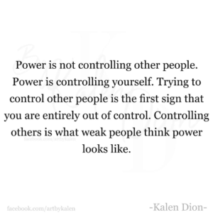 Power is not controlling other people. Power is controlling yourself. Trying to control other people is the first sign that you are entirely out of control. Controlling other people is what weak people think power looks like. ~Kalen Dion